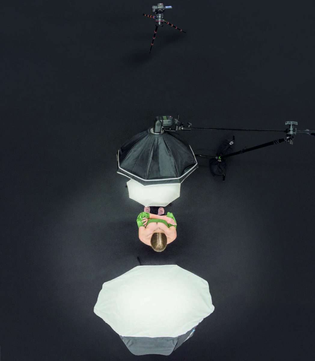 Hier wordt gebruikgemaakt van drie flitsers (al kan het ook met twee, zoals je in het onderdeel ‘Achter de schermen’ leest. Het hoofdlicht is een achthoekige softbox van 66 cm, die hoog en recht voor het onderwerp is en gekanteld is onder een hoek van zo’n 45°. Om de schaduwen onder hals en ogen op te vullen, is een laaggeplaatste identieke softbox onder een hoek van 45° omhoog op het onderwerp gericht. Om niet alleen een effen witte achtergrond te creëren, maar het licht ook langs de zijkanten van het gezicht te laten lopen, is een grote achthoekige softbox van 120 cm recht achter het onderwerp geplaatst.