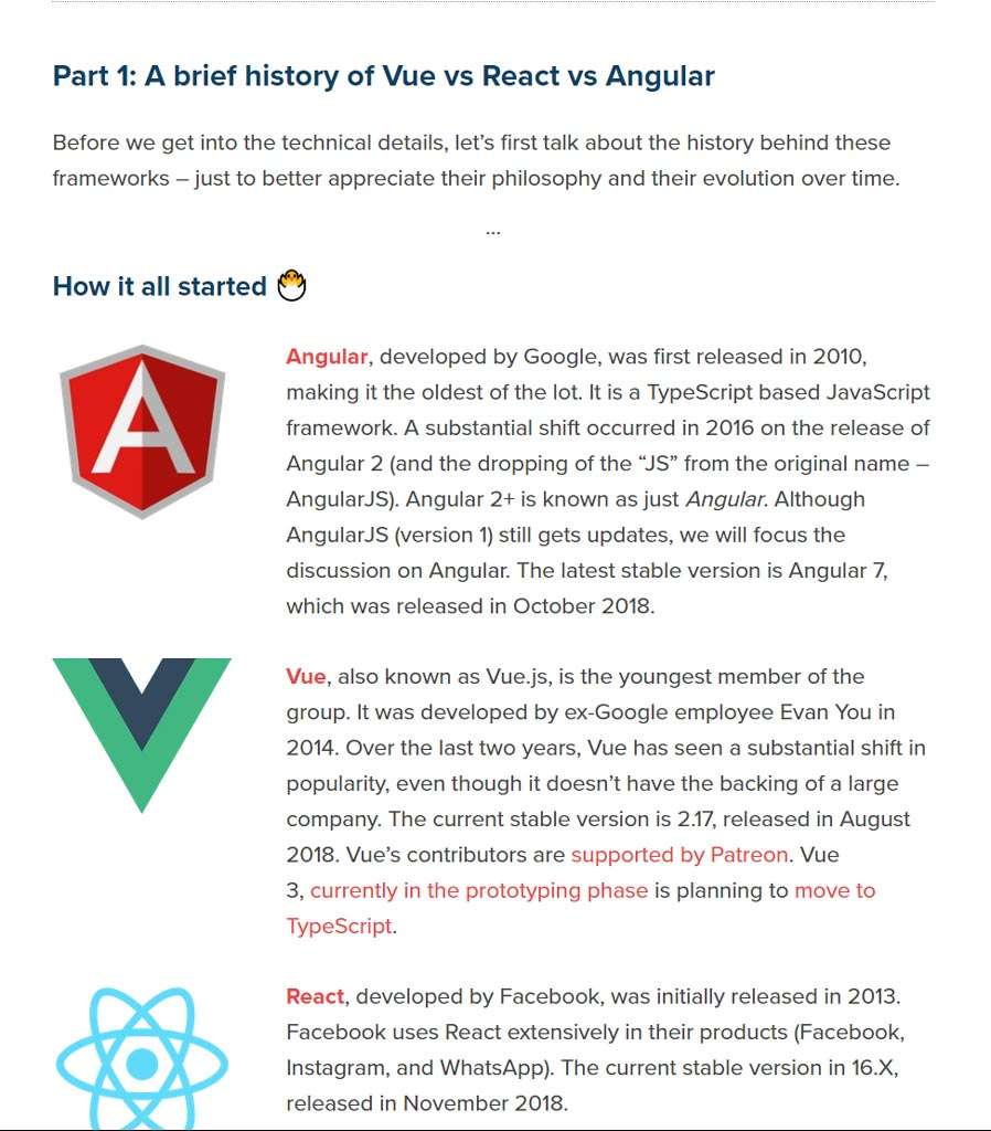 Dit is exact hetzelfde met front-end frameworks. Hoewel ontwikkelaars hartstochtelijk kunnen debatteren of wat nu het beste framework is, zal het de gemiddelde internetter een zorg zijn met welke techniek website A of B is gemaakt. Die wil gewoon zijn pizza’s bestellen of vakantie boeken. Kortom, kies gewoon een framework waar u zich prettig bij voelt, wat uw directe collega’s of binnen uw bedrijf gebruiken, of waar u de beste informatie over kunt vinden. Wilt u het naadje van de kous weten en een goede keuze maken, dan kunt u (uiteraard) op internet terecht. Lees bijvoorbeeld https://www.codeinwp.com/blog/angular-vs-vue-vs-react/ of https://medium.com/@TechMagic/reactjs-vs-angular5-vs-vue-js-what-to-choose-in-2018-b91e028fa91d