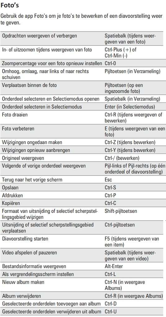 Er is natuurlijk veel meer in het boekje te vinden: toetscombinaties voor gebruik van Windows 10, van Edge, Internet Explorer, Mail of Continuum. Je bent een wizzkid als je ze allemaal uit je hoofd weet… Maar… Als Edge de browser is die je altijd gebruikt, kan het helemaal geen kwaad om je in de toetscombinaties van Edge te verdiepen. Als voorbeeld uit het boek zie je in deze blogpost alle mogelijke toetscombinaties van de Microsoft Foto’s applicatie.