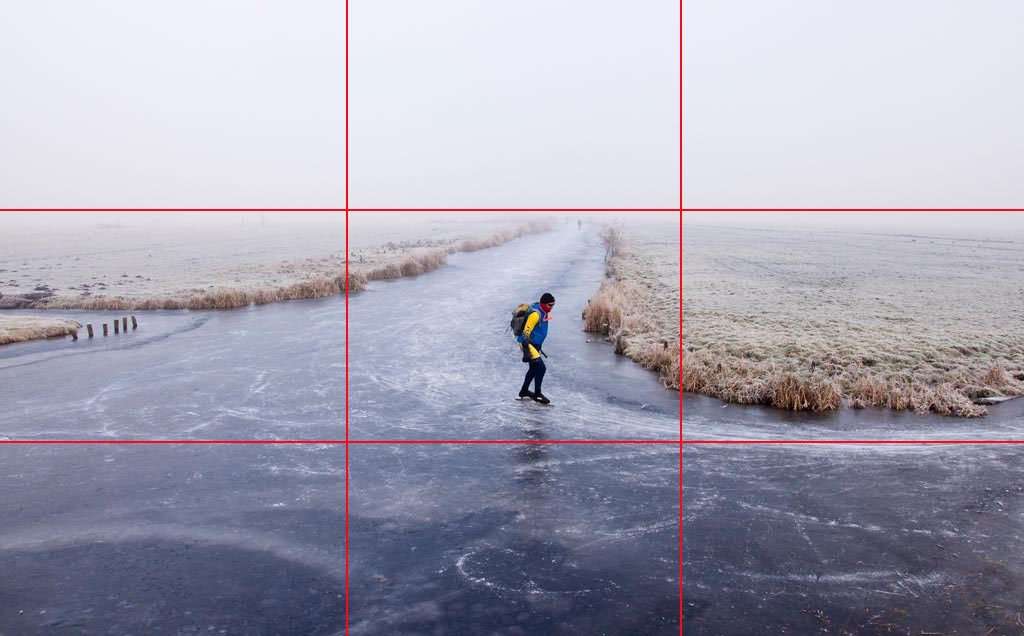 Voorbeeld van de eenderde regel: Voorgrond tweederde, lucht eenderde, in de middelste strook de weilanden, de schaatser in het middelste vak. Nikon D90 • ISO 400 • f/9 • 1/320 @ 18mm.