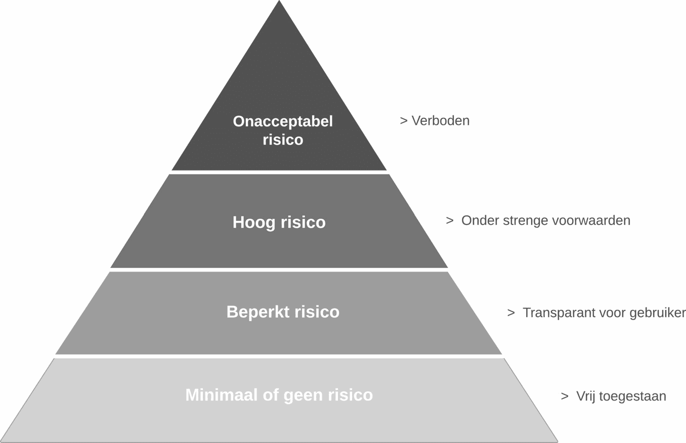 De AI Act gaat uit van risicocategorieën die gebaseerd zijn op de mate van risico die een AI-toepassing voor burgers vormt. Aan de hand van risicocriteria valt een AI-toepassing in een categorie en de AI Act geeft per categorie de bepalingen en voorwaarden waaronder men de desbetreffende AI mag leveren en gebruiken.