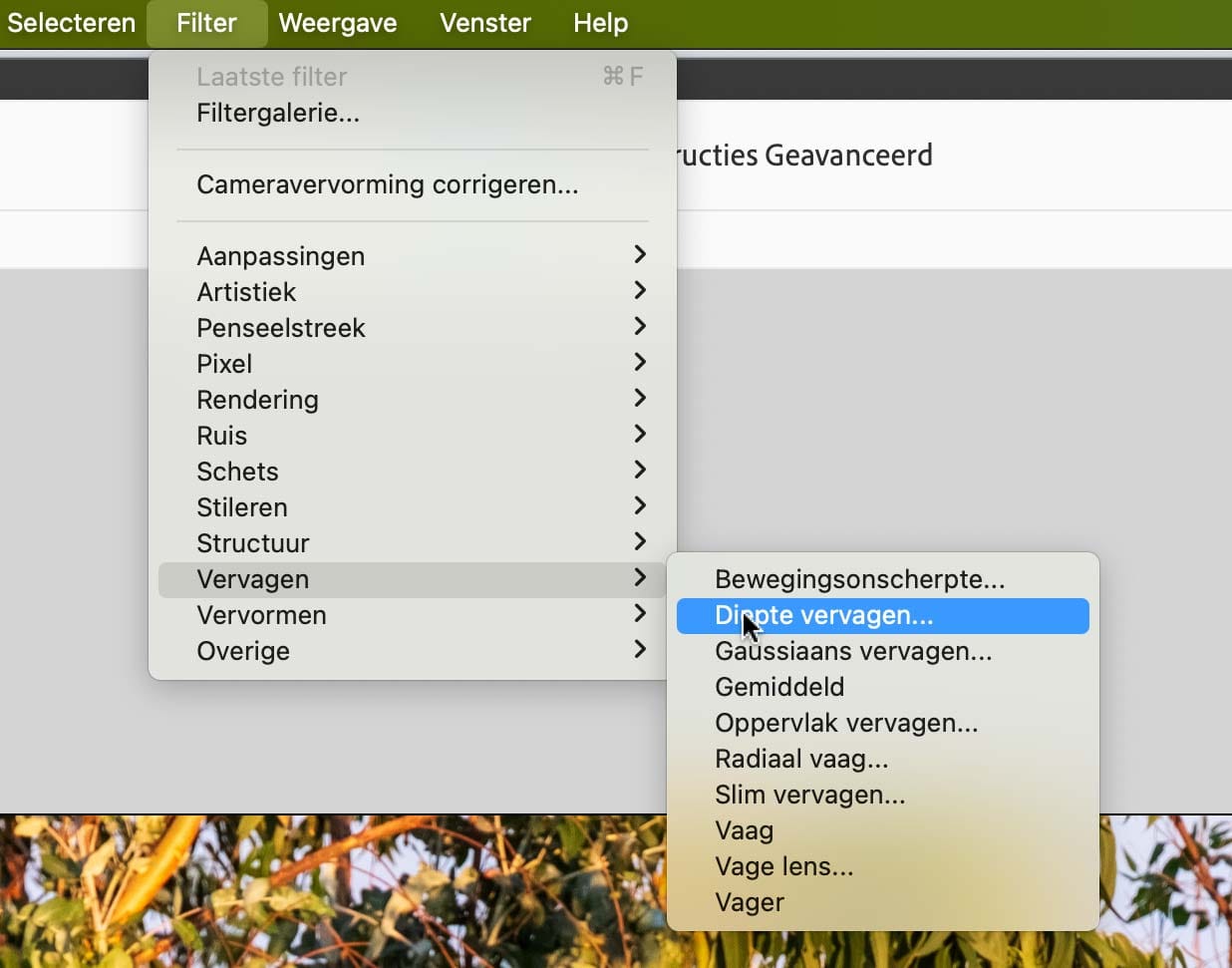 Open een foto waarvan je de scherptediepte wilt veranderen in de Photoshop Elements Editor. Kies uit het menu Filter bij Vervagen voor het onderdeel Diepte vervagen. Elements gaat meteen voor je aan de gang. Photoshop Elements haalt uit de info in de foto waarop tijdens het maken van is scherp gesteld en gaat daarmee aan het werk. De achtergrond wordt onscherper gemaakt.