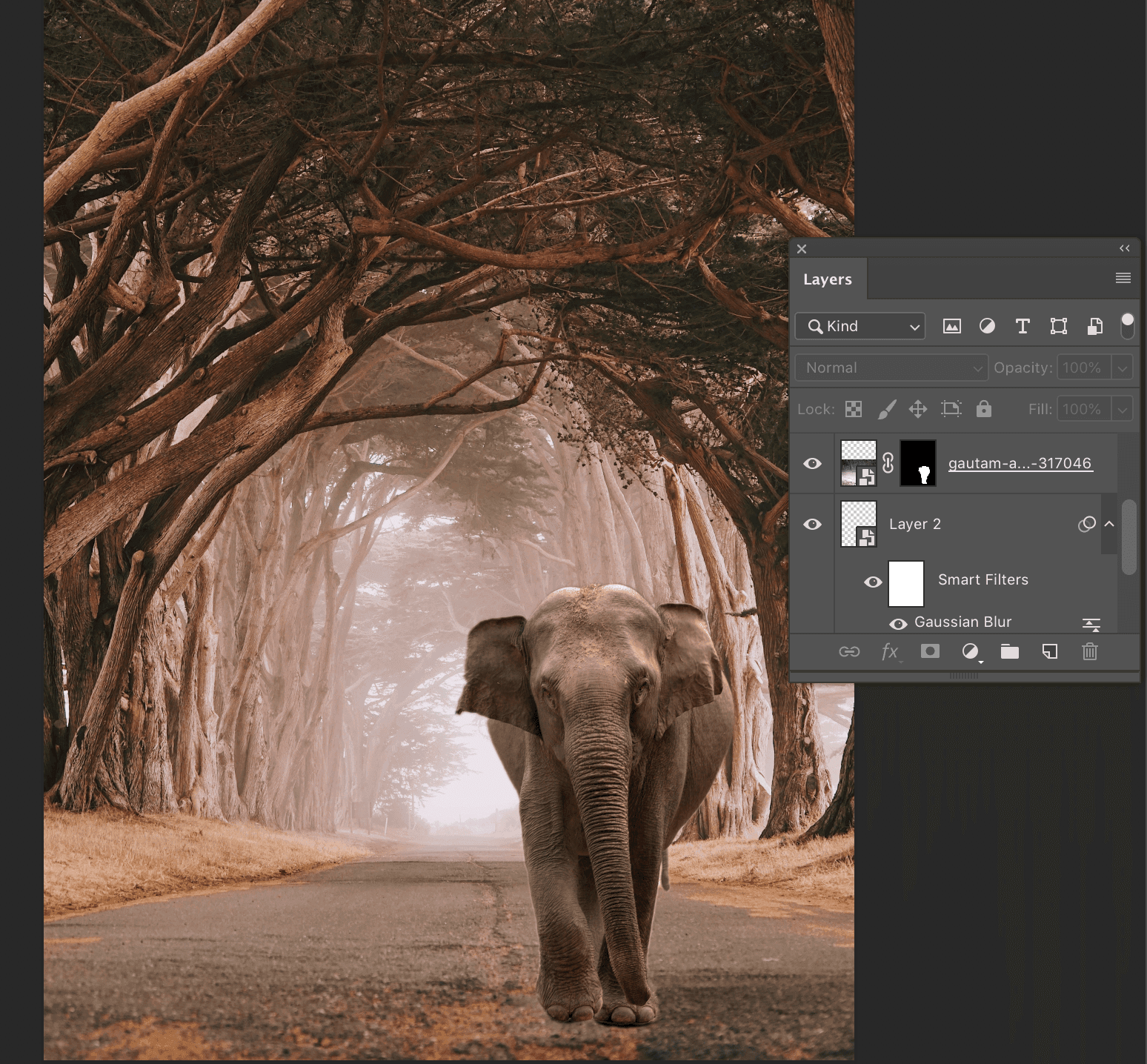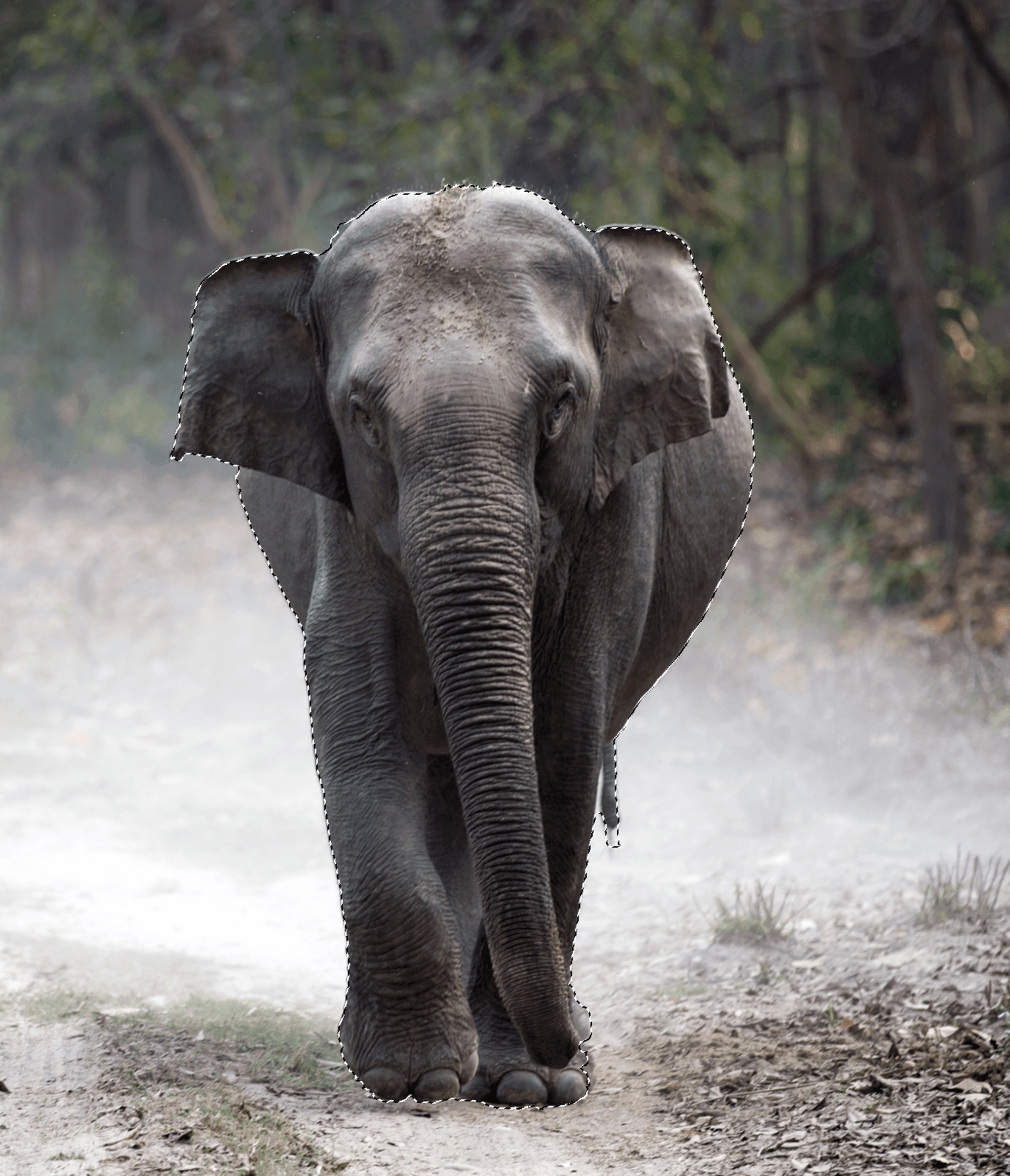 Als je op die knop klikt, dan berekent Photoshop door middel van kunstmatige intelligentie wat het onderwerp in je foto is en selecteert het direct. De selectie die gemaakt wordt is vaak al erg goed, waardoor je die nog maar een heel klein beetje bij hoeft te werken. In het geval van de olifant was dit het directe resultaat: