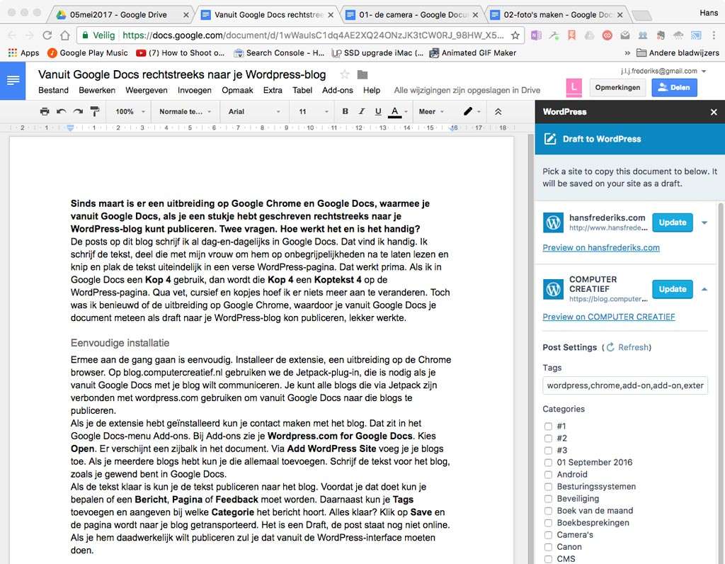 De posts op dit blog schrijf ik al dag-en-dagelijks in Google Docs. Dat vind ik handig. Ik schrijf de tekst, deel die met mijn vrouw om hem op onbegrijpelijkheden na te laten lezen en knip en plak de tekst uiteindelijk in een verse WordPress-pagina. Dat werkt prima. Als ik in Google Docs een Kop 4 gebruik, dan wordt die Kop 4 een Koptekst 4 op de WordPress-pagina. Qua vet, cursief en kopjes hoef ik er niets meer aan te veranderen. Toch was ik benieuwd of de uitbreiding op Google Chrome, waardoor je vanuit Google Docs je document meteen als draft naar je WordPress-blog kon publiceren, lekker werkte.