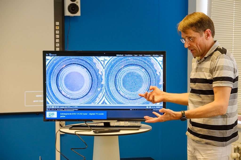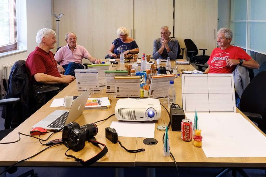 Een van de onderwerpen die Pieter behandelde was het fotograferen van een interieur. Het interieur was de ruimte waarin de workshop plaats vond. Dit soort foto’s moet je eigenlijk maken van een statief, zodat horizontaal en verticaal lopen zoals ze moeten. In geval van nood, als je in de haast de camera toch niet goed horizontaal hebt gehouden, is er natuurlijk altijd nog Lightroom of Adobe Camera Raw om met het deelvenster Transformatie de lijnen goed horizontaal en verticaal te zetten. (Maar een echte fotograaf doet het goed in de camera, merkte een van de cursisten op.)