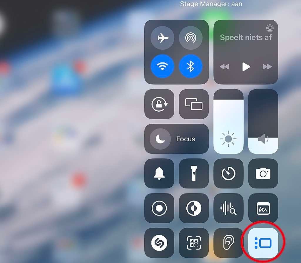Het eerste wat ons opviel – combinatie met het hier gebruikte testscherm – was dat het tweede scherm wel erg flets oogde. Ook toonde het precies dezelfde inhoud als het iPad-scherm, inclusief de uit alle voorgaande versies van iPadOS bekende zwarte balken aan de zijkanten. Dit laatste verschijnsel is wel heel makkelijk te verklaren: Stage Manager wordt niet automatisch ingeschakeld als u een extern scherm koppelt. Wat betekent dat het zich gedraagt zoals in al die oudere iPad-versies: als een spiegel van het hoofdscherm, waarbij sommige apps hun inhoud schermvullend op ’t externe scherm kunnen tonen. Om volop gebruik te kunnen maken van de nieuwe functionaliteit is het zaak om eerst Stage Manager aan te zetten. Dat gaat het makkelijkst door vanuit de rechter bovenhoek van het scherm naar beneden te vegen; het Bedieningspaneel opent dan. Tik hierin op de knop voor Stage Manager en dit onderdeel wordt aangezet.